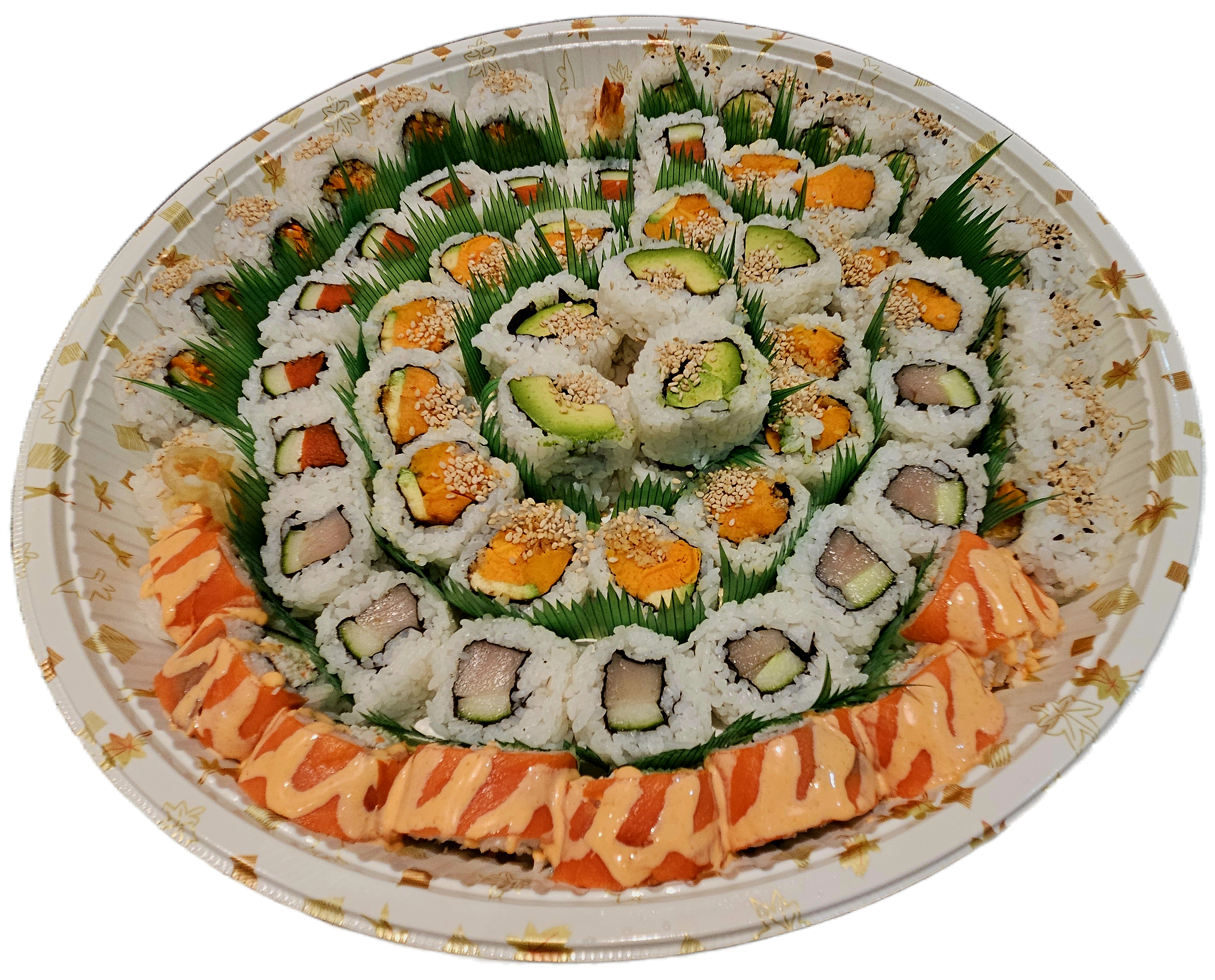 8 pcs of Rainbow, Cherry Blossom, Alaska, Grilled Chicken, Smoked Salmon, Crunch, Tuna Cado, Spicy Tuna Cado rolls, 26 pcs of assorted Salmon and Tuna sashimi (click here to see photo 1) (click here to see photo 2)
