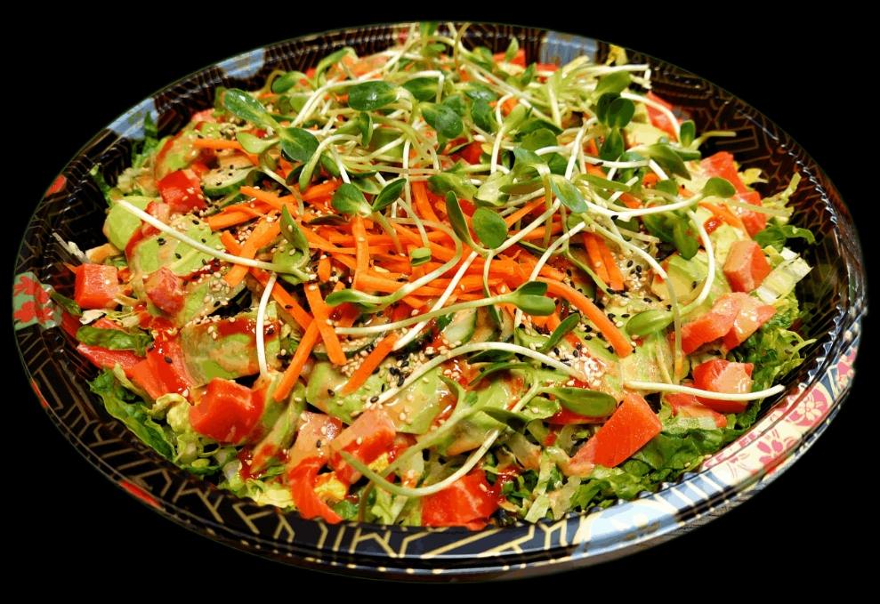 Romaine lettuce, Avocado, Wild Sockeye Salmon, Cucumber, Carrot, Local Organic Sunflower sprouts, Sugar-free vegie steak sauce