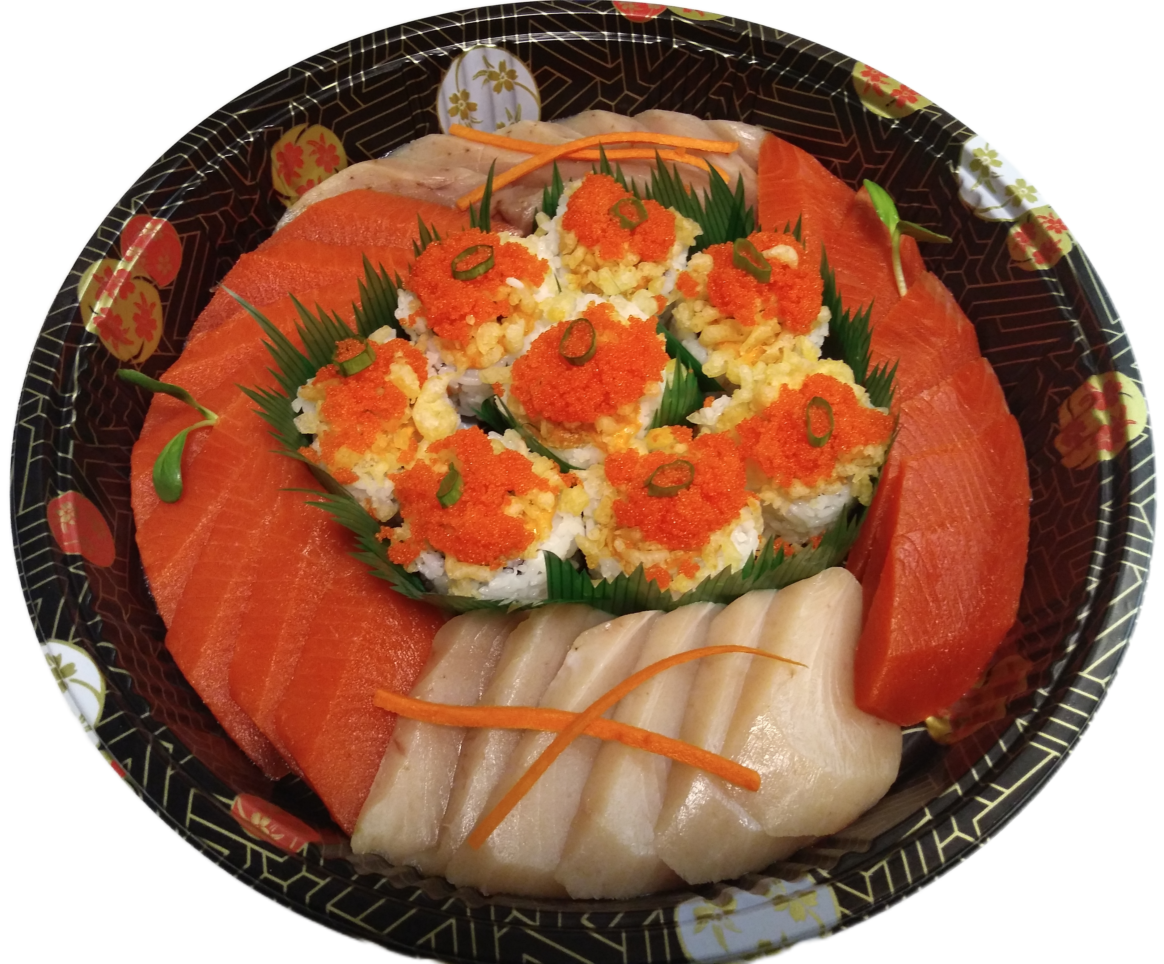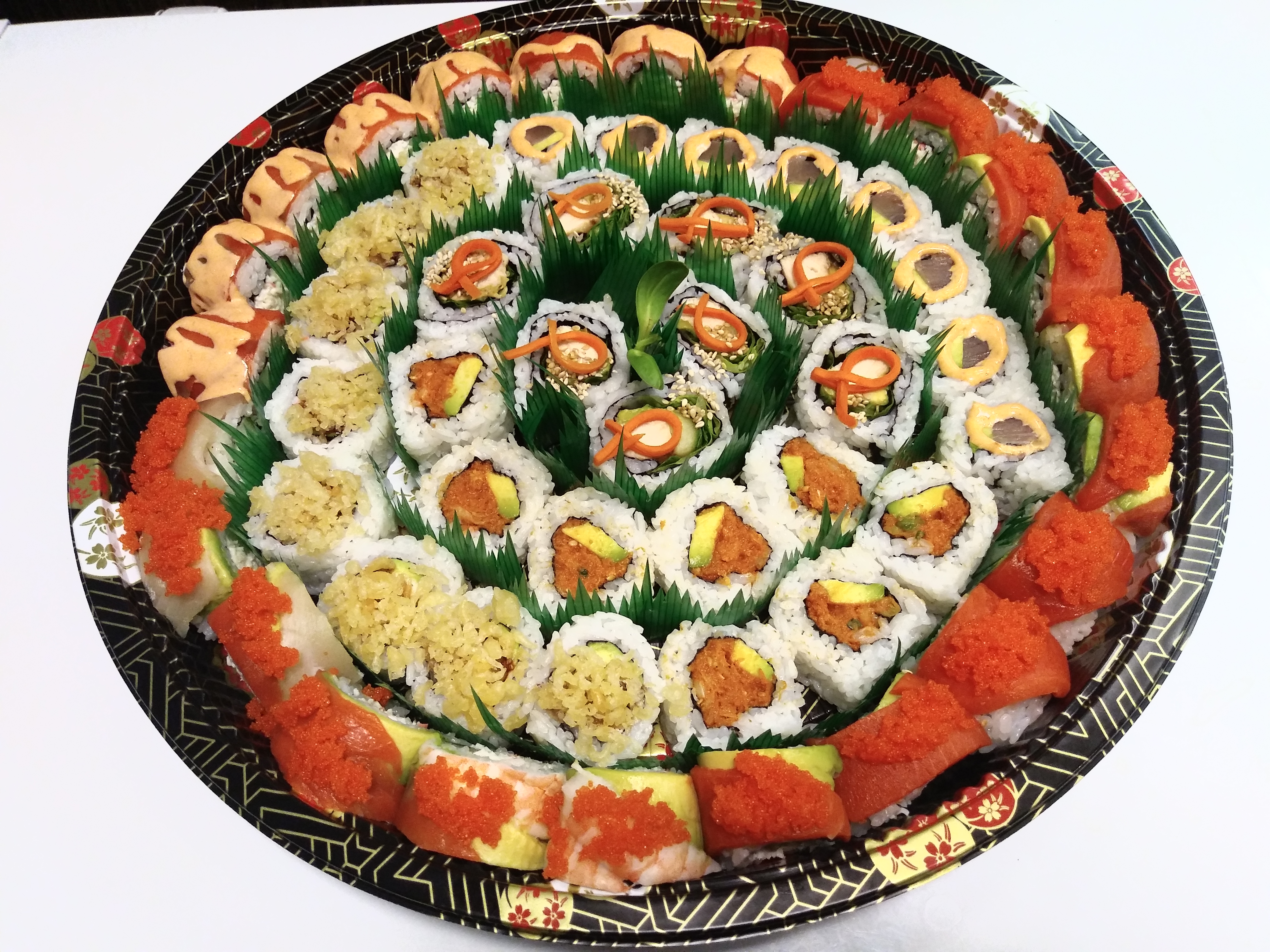 8 pcs of Rainbow, Cherry Blossom, Alaska, Grilled Chicken, Smoked Salmon, Crunch, Tuna Cado, Spicy Tuna Cado rolls, 26 pcs of assorted Salmon and Tuna sashimi (click here to see photo 1) (click here to see photo 2)